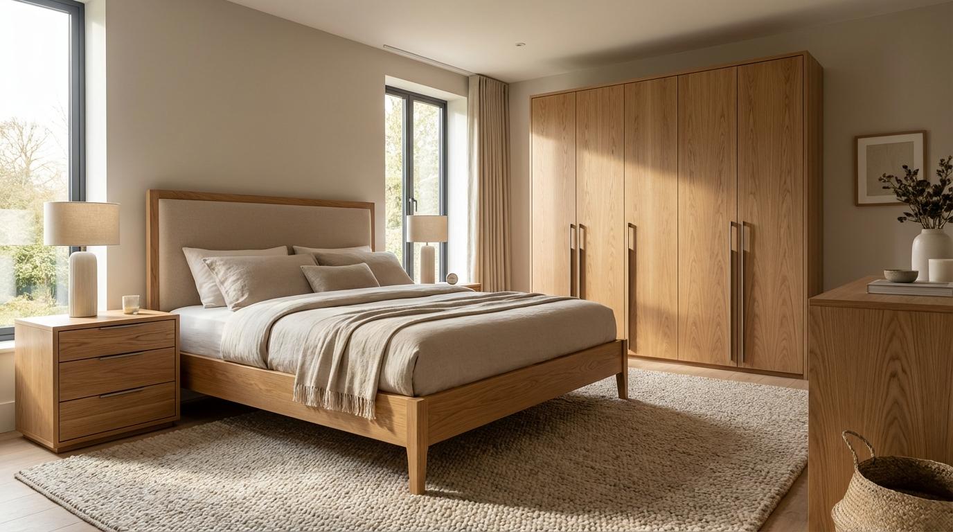 Wadą gotowych zestawów jest ich sztywność — nie zawsze pasują proporcjami do konkretnej sypialni, a zwykle są projektowane dla przeciętnych wymiarów. Jeśli Twoja sypialnia ma niestandardowe wymiary, skośne ściany lub wnęki, gotowy zestaw może nie pasować idealnie.